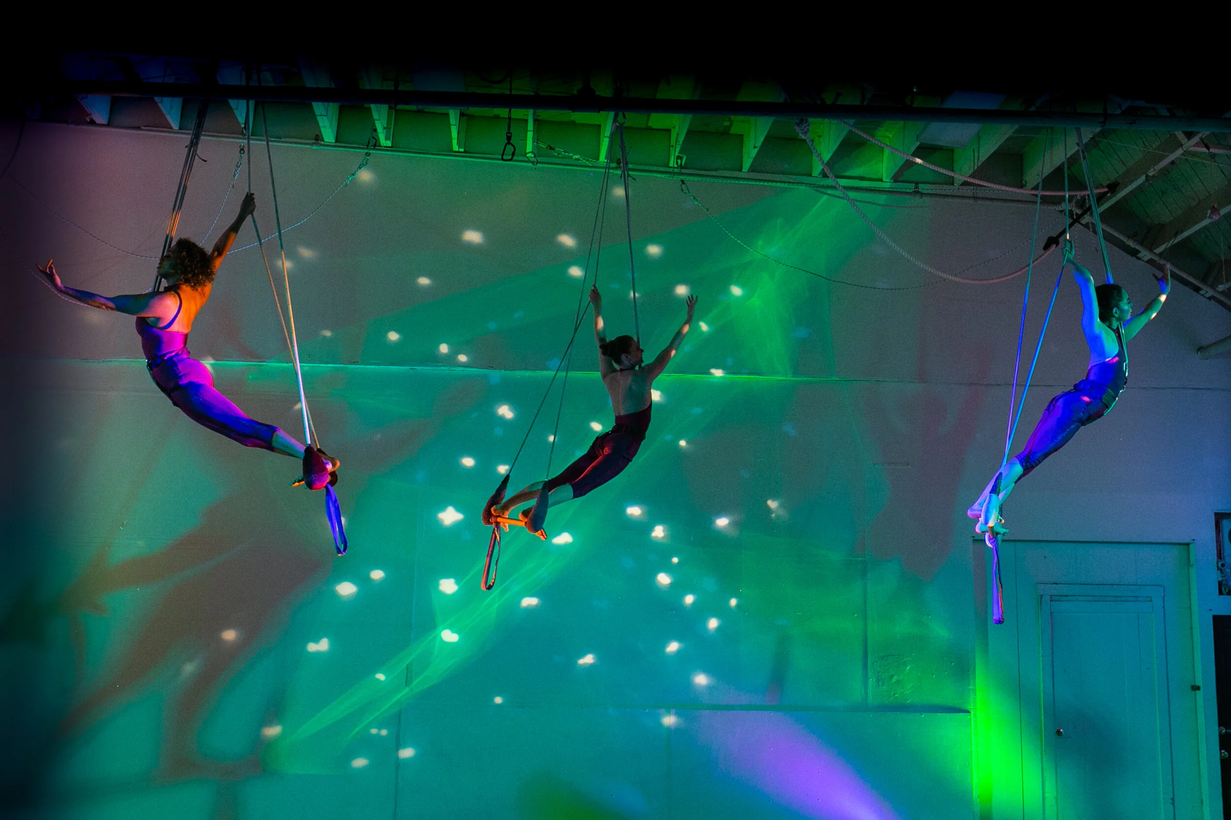 Created in 2019 this is an aerial dance for 3 dancers on 3 trapezes and bungee combination. The dance is inspired by my trip to Alaska to view the northern lights.